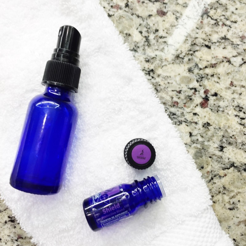 Simply start with a 2 oz. dark glass bottle, add 1 tsp of organic witch hazel, and add 15 drops of your DIY Thieves Oil.