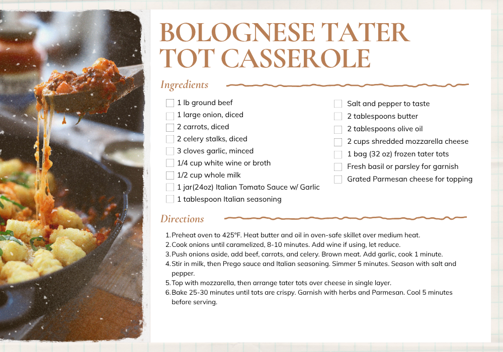 This recipe is pure comfort food magic! It’s like a mashup between classic Italian bolognese and that beloved Midwest tater tot casserole, and trust me, it works beautifully. We start with slowly caramelized onions, add ground beef and those secret vegetables that make a traditional bolognese so rich, then top it all with cheese and crispy tater tots. The cast iron skillet does all the work, from stovetop to oven, and the result is golden, crispy tots on top with a rich, flavorful meat sauce underneath. This one’s a guaranteed crowd-pleaser!