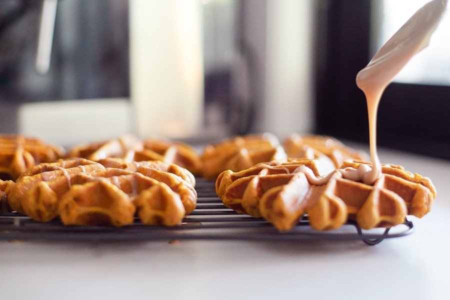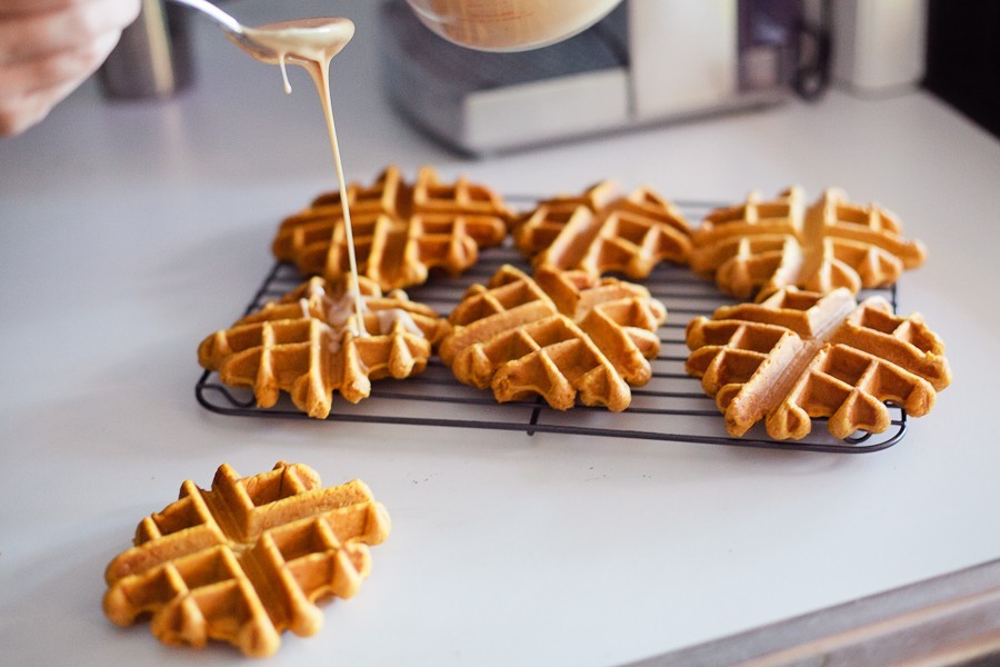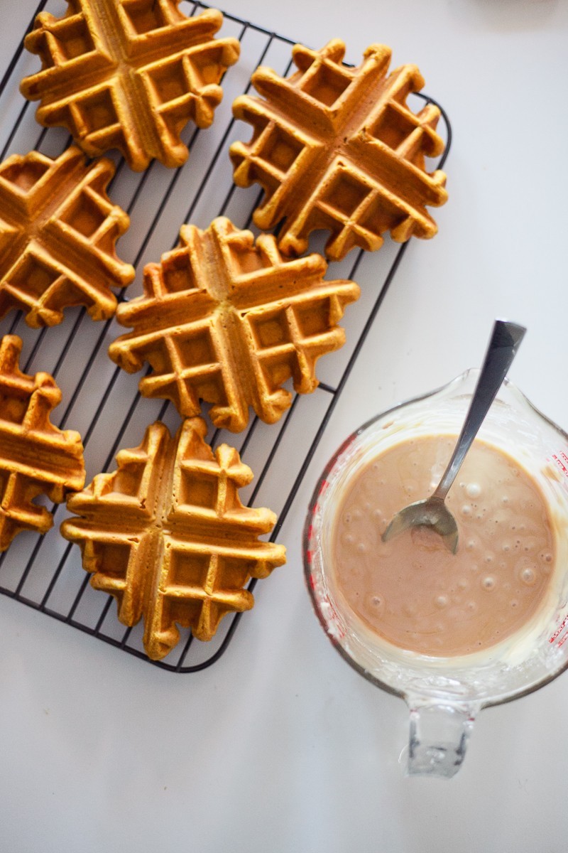 - When the donuts are cool but still warm, pour over top of waffles, coating well and let set on wire rack to let frosting set.